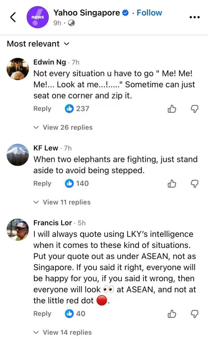 黄循财的言论不仅惹恼了中国民众,在新加坡国内也引发舆论反弹,不少新加坡民众明确反对其观点。有网友直言:“两只大象打架时,站远些才不会被波及。” 还有人批评道:“并非任何时候都要跳出来刷存在感,有时候坐在角落保持沉默反而更明智。” 另有新加坡网民指出:“本应简明表达希望两国尽快解决分歧即可,不应贸然评论日本在东盟地区的安全角色——或许他本意是想强调日本应发挥更具建设性的作用,但措辞表达明显跑偏。” 坦率地讲,在处理大国关系的分寸感上,不少新加坡民众的认知水准,不知道比黄循财高到哪里去了。