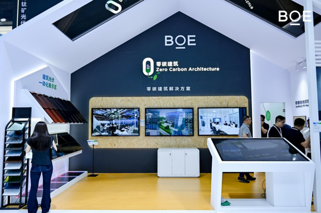 在零碳建筑展区内,BOE(京东方)展出首发的钙钛矿全场景BIPV(建筑光伏一体化)产品及解决方案,通过钙钛矿优异的发电性能,结合独特外玻处理技术,打造了模拟建材纹理的光伏艺术墙;并充分利用钙钛矿的柔性、透光性,推出光伏瓦、光伏幕墙、光伏砖等全系列产品,提升了产品质感的同时还为建筑美学减碳提供可能。同时,BOE(京东方)展出的零碳建筑解决方案以楼宇为载体,通过物联网技术及AI智能算法相结合,实时采集楼栋能耗数据并进行调节,有效提升设备运行效率,降低运营碳排放量,助力实现零碳目标。