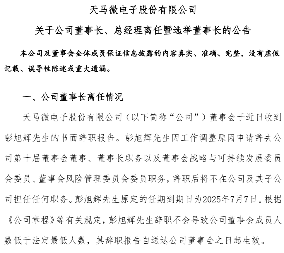 6月12日,天马微电子股份有限公司(以下简称“公司”)董事会于近日收到彭旭辉先生的书面辞职报告。彭旭辉先生因工作调整原因申请辞去公司第十届董事会董事、董事长职务以及董事会战略与可持续发展委员会委员、董事会风险管理委员会委员职务,辞职后将不在公司及其子公司担任任何职务。彭旭辉先生原定的任期到期日为2025年7月7日。根据《公司章程》等有关规定,彭旭辉先生辞职不会导致公司董事会成员人数低于法定最低人数,其辞职报告自送达公司董事会之日起生效。